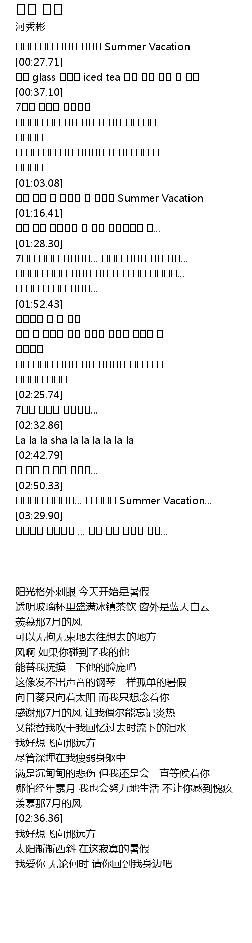 | [03:20.92] | 하루해가 저물어요... 이 외로운 Summer Vacation... |
