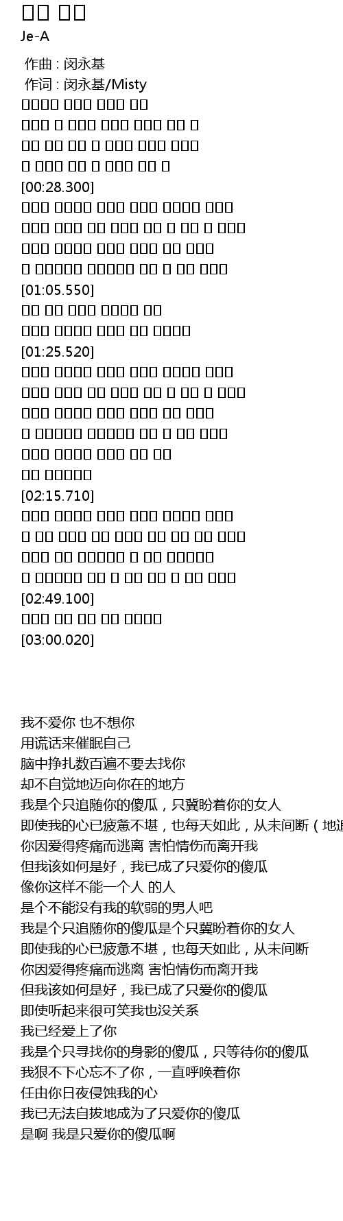 | [02:37.910] | 참 미련스럽죠 어쩔 수 없죠 벌써 난 그대 바본걸 |