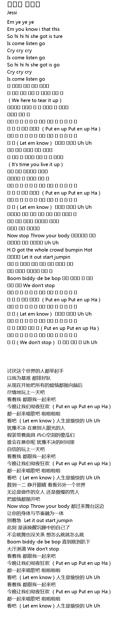 | [01:38.290] | 이 밤 밤 새워 흔들어 (Put en up Put en up Ha) |