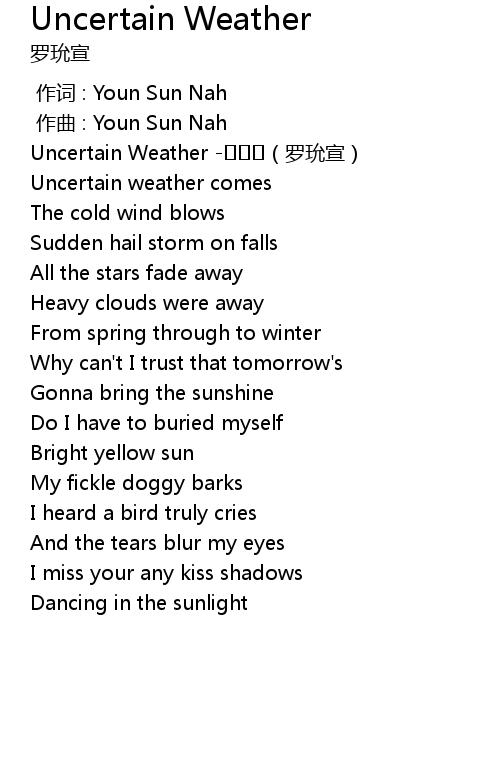 | [00:00.141] | Uncertain Weather -나윤선(罗玧宣) |
