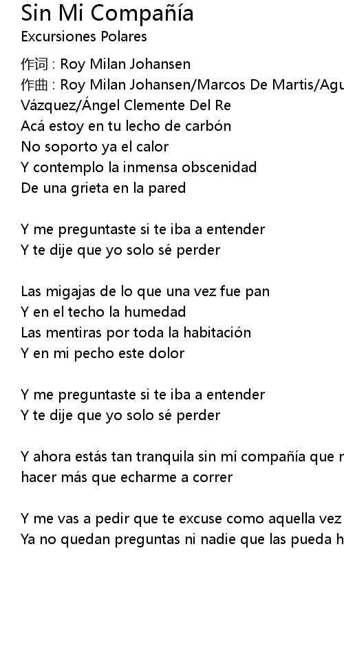 | Y ahora esta s tan tranquila sin mi compai a que no hay nada que pueda yo hacer ma s que echarme a correr | |