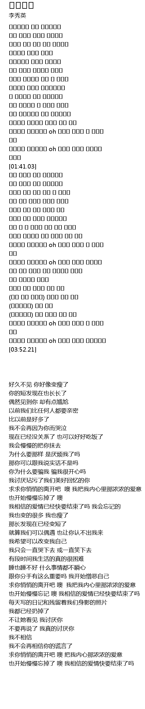 [03:41.13] 아낌없이 잊어버려요 oh 믿었던 사랑의 끝인건가요