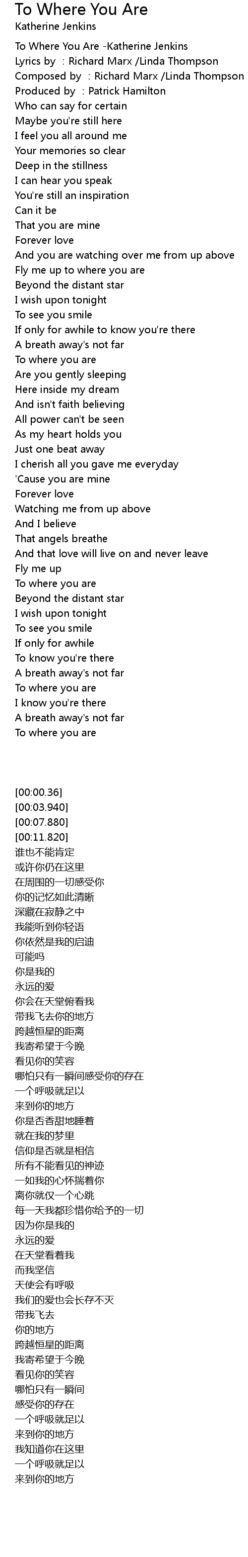 | [00:00.36] | To Where You Are Katherine Jenkins |