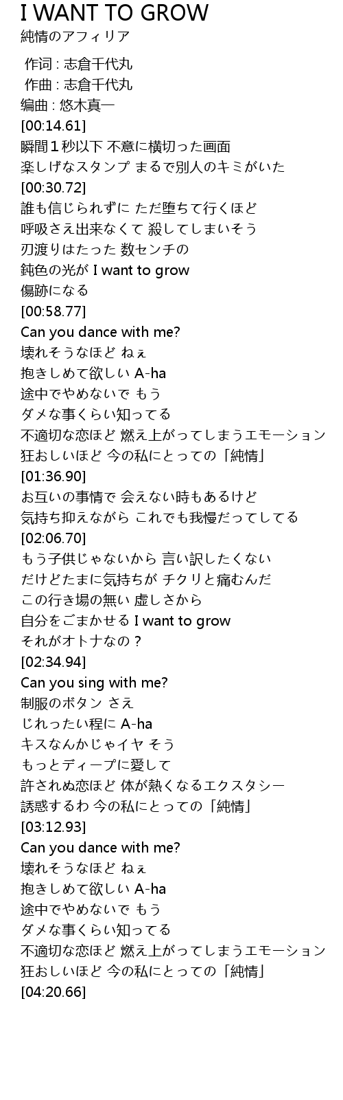 | [04:07.74] | 狂おしいほど 今の私にとっての「純情」 |