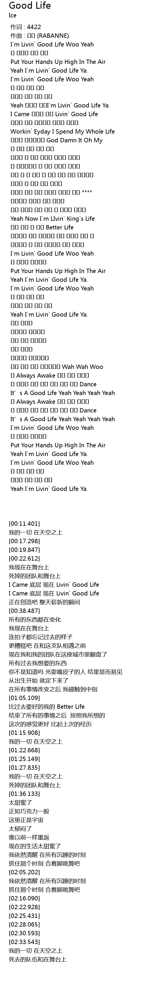 | [00:11.401] | I`m Livin` Good Life Woo Yeah |