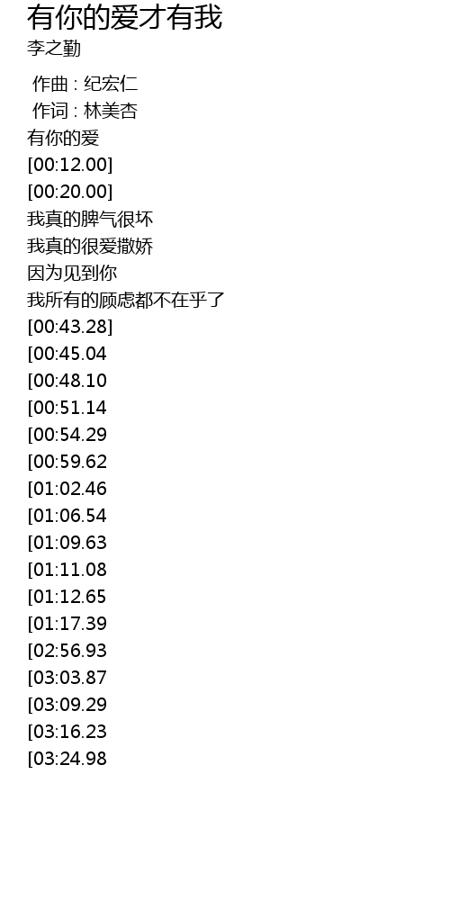 | [03:31.05][02:56.93][01:21.37] | 有你的爱 |
