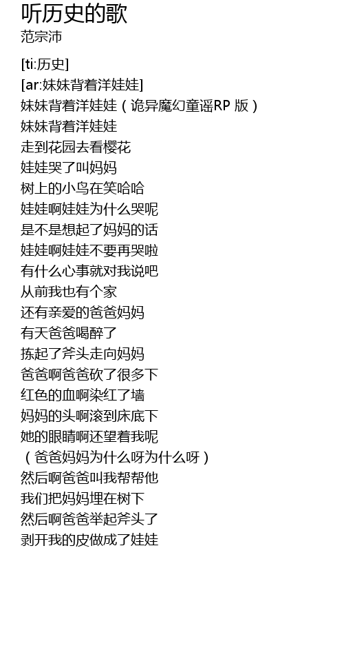| [00:00.876] | 妹妹背着洋娃娃(诡异魔幻童谣RP 版) |