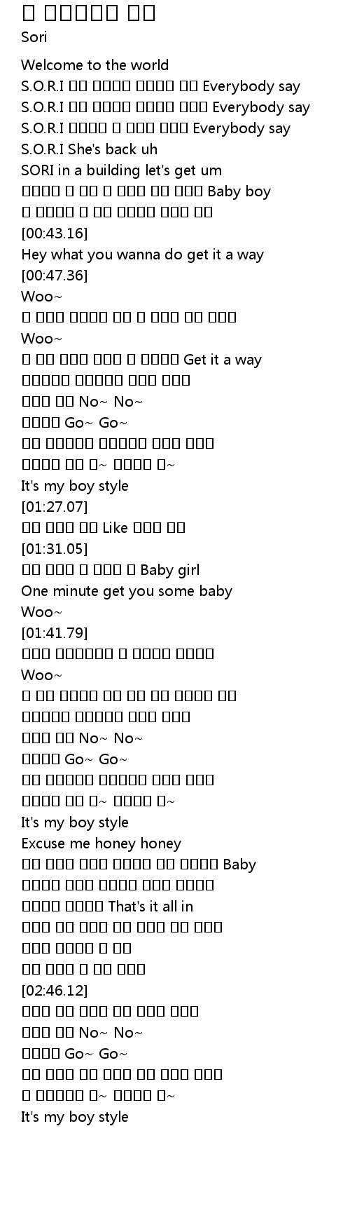 | [00:17.84] | S.O.R.I 나와함께 이 순간을 즐겨봐 Everybody say |