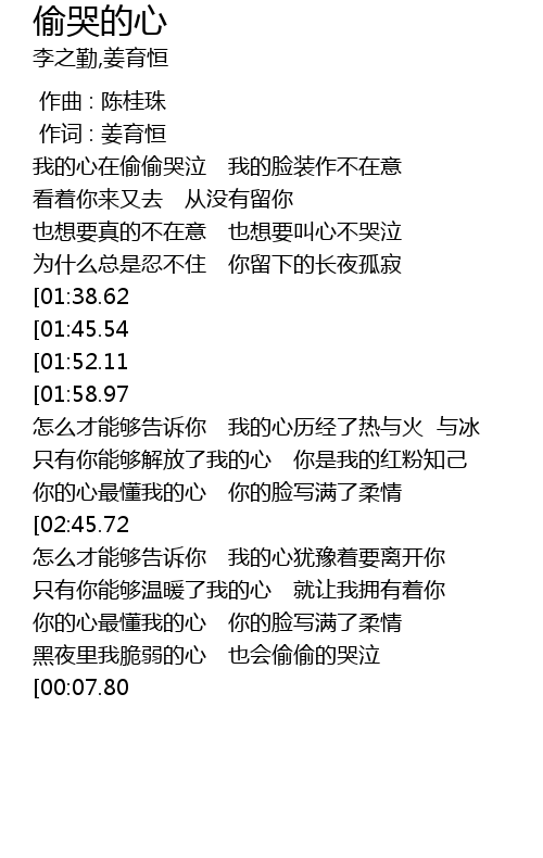 | [00:41.36] | 我的心在偷偷哭泣 我的脸装作不在意 |