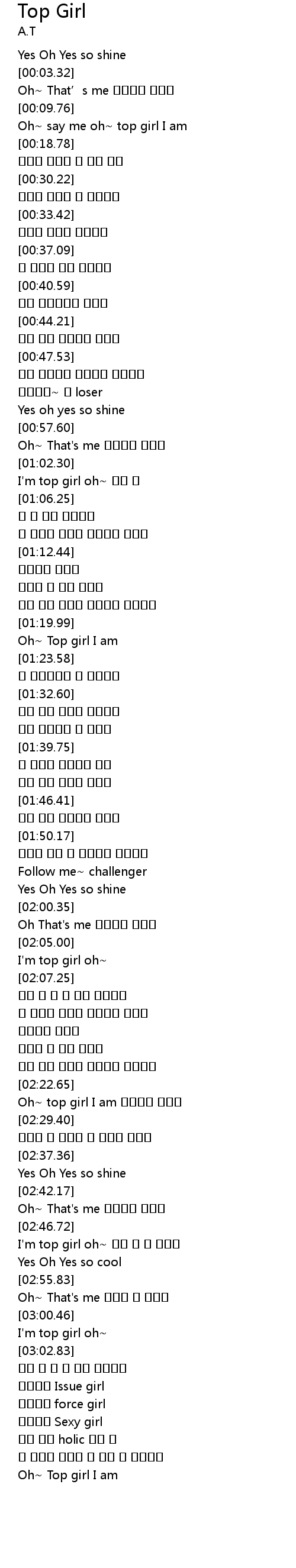 | [01:03.00] | I'm top girl oh~ 모든 걸 |