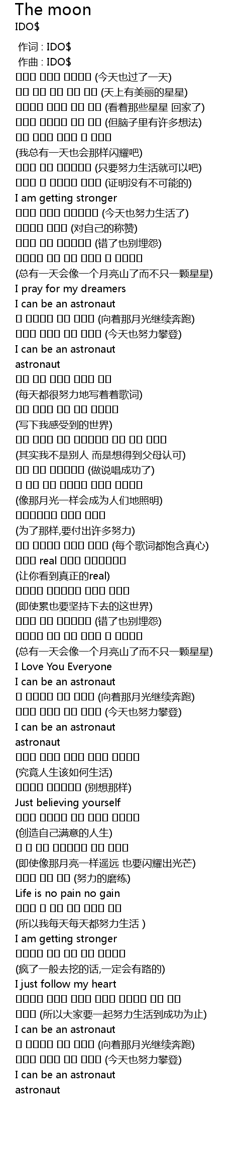 | [01:43.797] | 언제가는 별이 아닌 달처럼 빛 날꺼니깐 (总有一天会像一个月亮山了而不只一颗星星) |