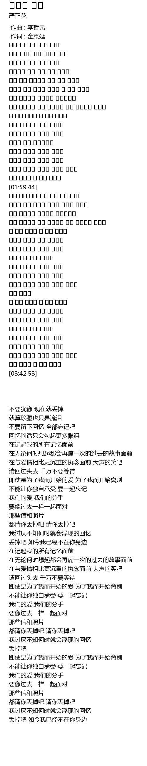 | [03:36.79] | 지금 버려요 난 이제 없잖아 |