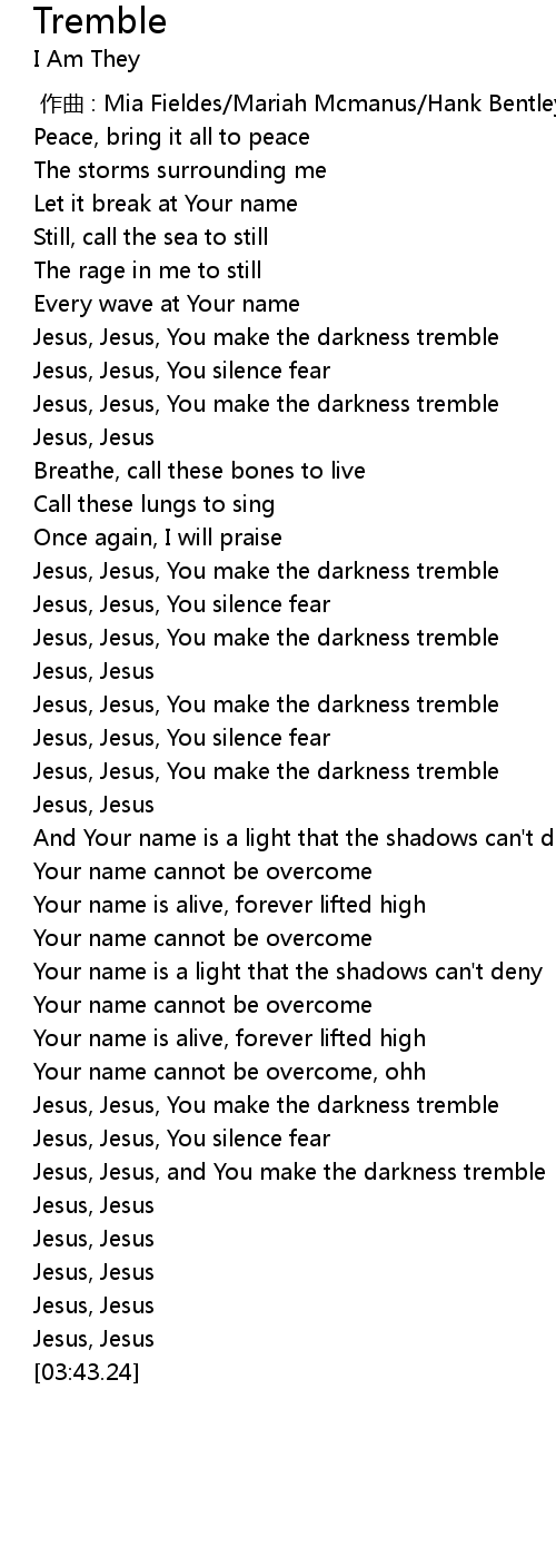 | [00:43.50] | Jesus, Jesus, You make the darkness tremble |