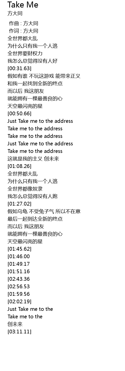 | [02:54.12][02:43.36][01:54.96] | Just Take me to the address |