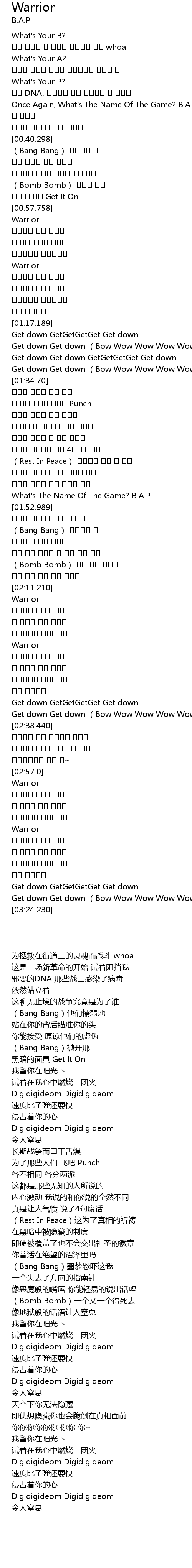 | [00:35.408] | Once Again, What' s The Name Of The Game? B. A. P |