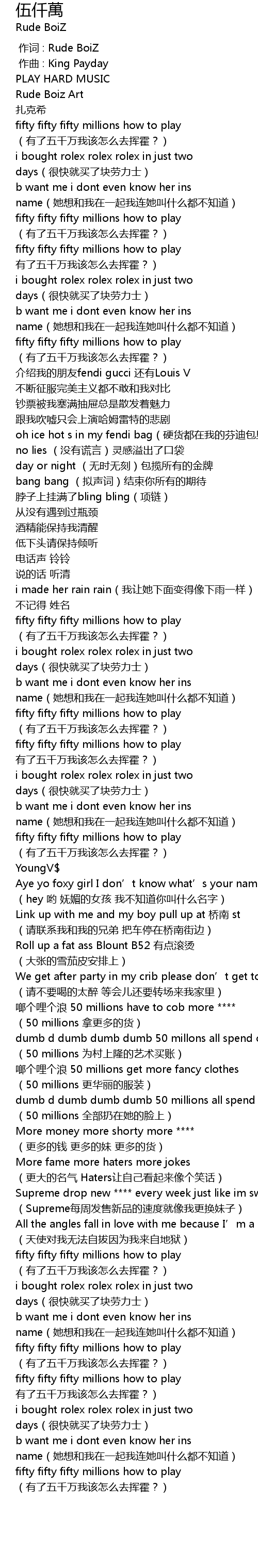| [01:39.586] | fifty fifty fifty millions how to play 有了五千万我该怎么去挥霍?) |