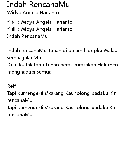 | Indah rencanaMu Tuhan di dalam hidupku Walau ku tak tahu dan ku tak mengerti semua jalanMu | |