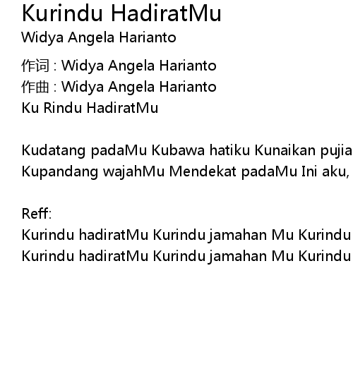 | Kurindu hadiratMu Kurindu jamahan Mu Kurindu Engkau Tuhan Lawatlahku skarang Kurindu hadiratMu Kurindu jamahan Mu Kurindu Engkau Tuhan Jamahlah ku skarang |