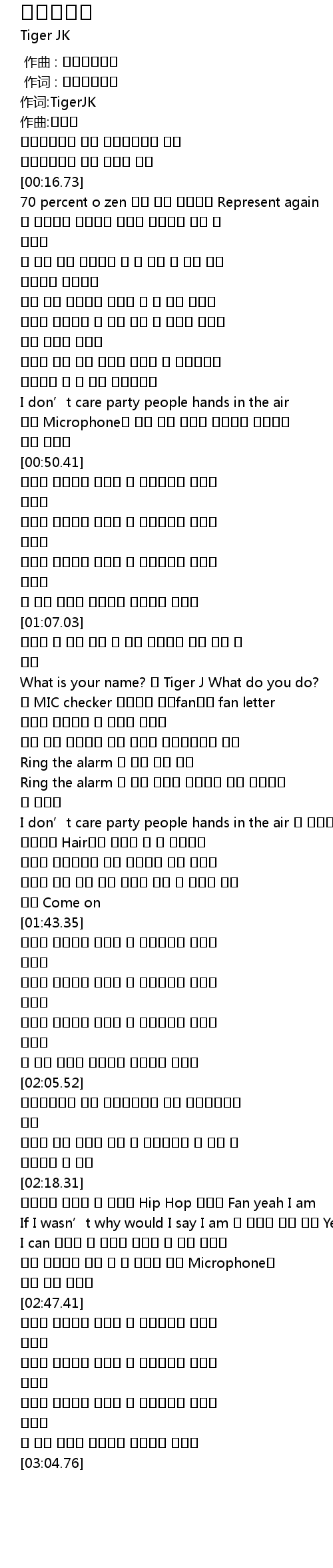 | [01:11.69] | What is your name? 난 Tiger J What do you do? |