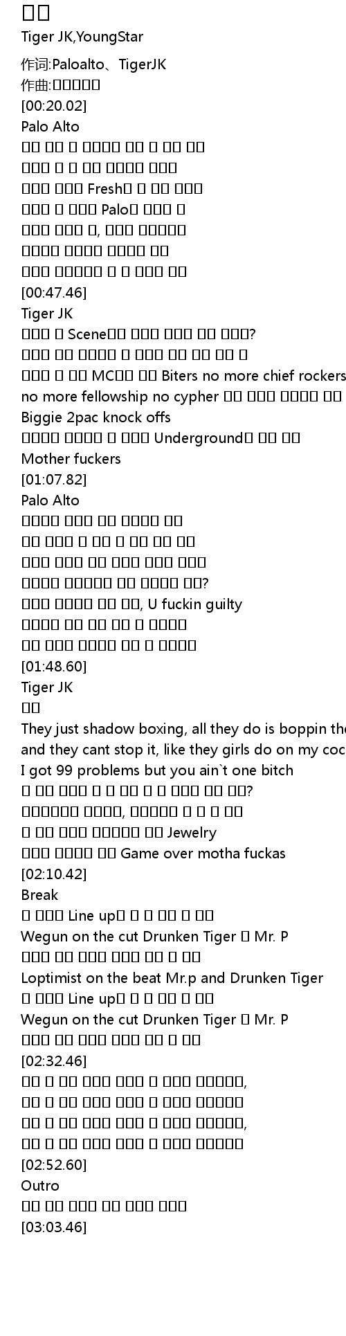 | [01:48.89]Tiger JK] | 여기저기 네게 Jab을 던졌지만 그들의 팔은 짧지 |