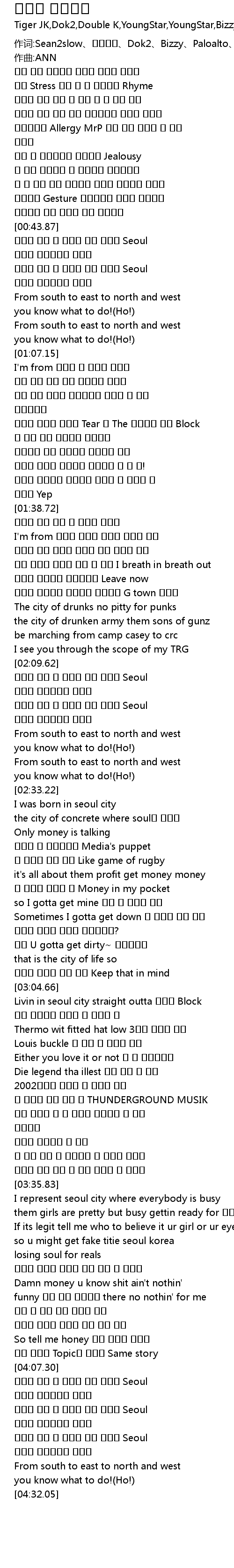 | [00:02.81] | 作词:Sean2slow、더블케이、Dok2、Bizzy、Paloalto、Tiger JK |