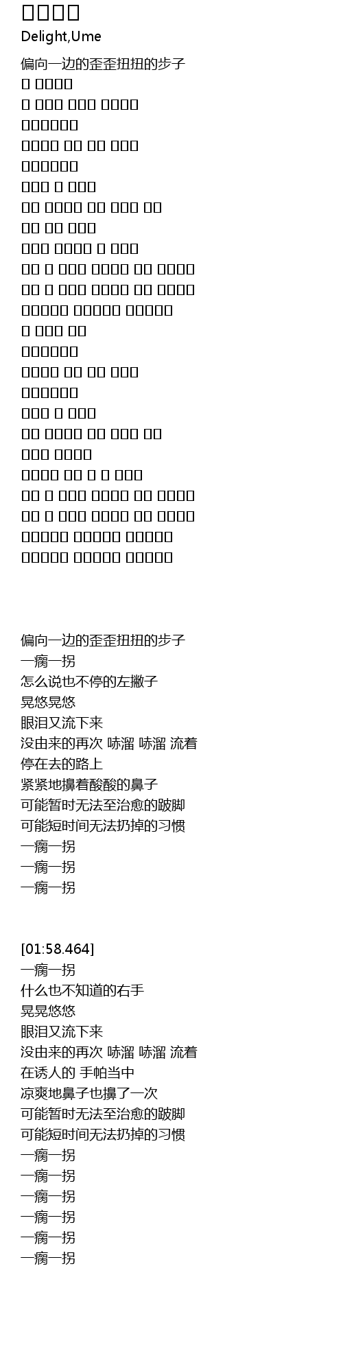 | [02:40.512] | 아마 한 동안은 고쳐지지 않을 절름발이 |