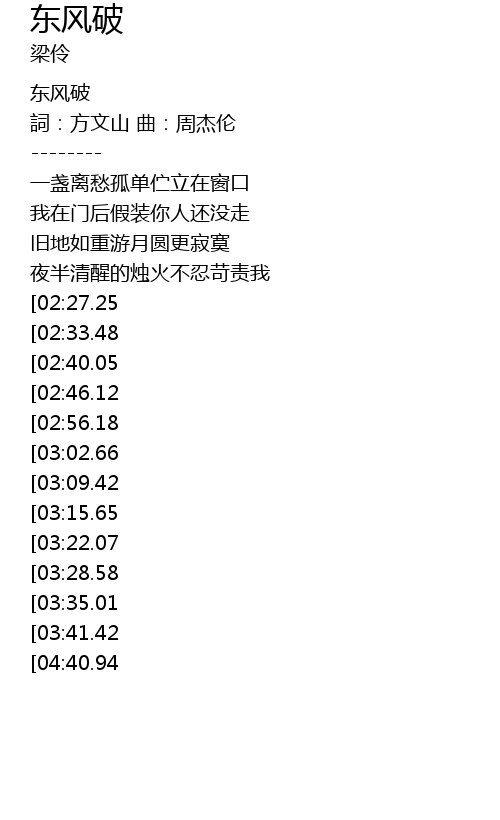 | [04:13.98][03:22.07][01:35.11] | 谁在用琵琶弹奏一曲东风破 |