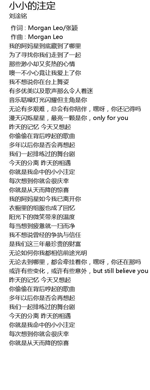 | [02:53.326] | nǐ jiù shì wǒ mìng zhòng de xiǎo xiǎo zhù dìng |