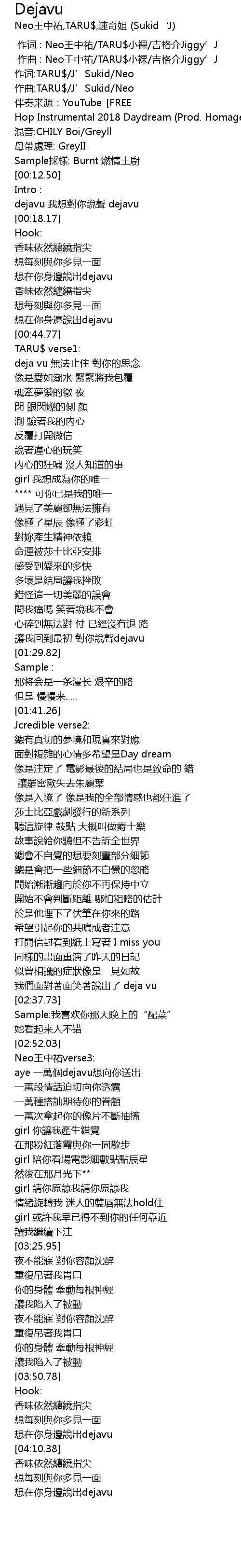 | [00:01.000] | 作曲 : Neo王中祐/TARU$小裸/吉格介Jiggy’J |