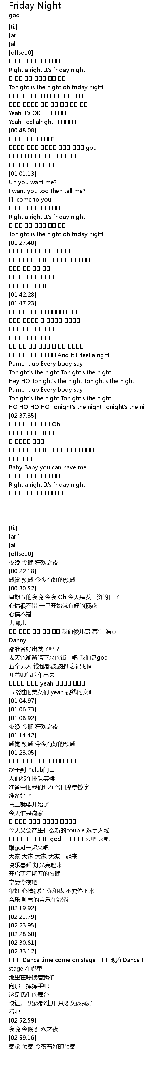 | [00:22.18] | Right alright It' s friday night |