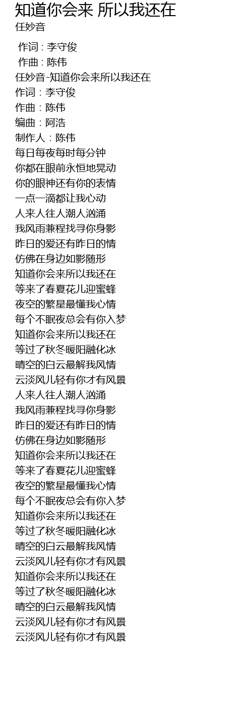 | [00:00.247] | 任妙音-知道你会来所以我还在 |