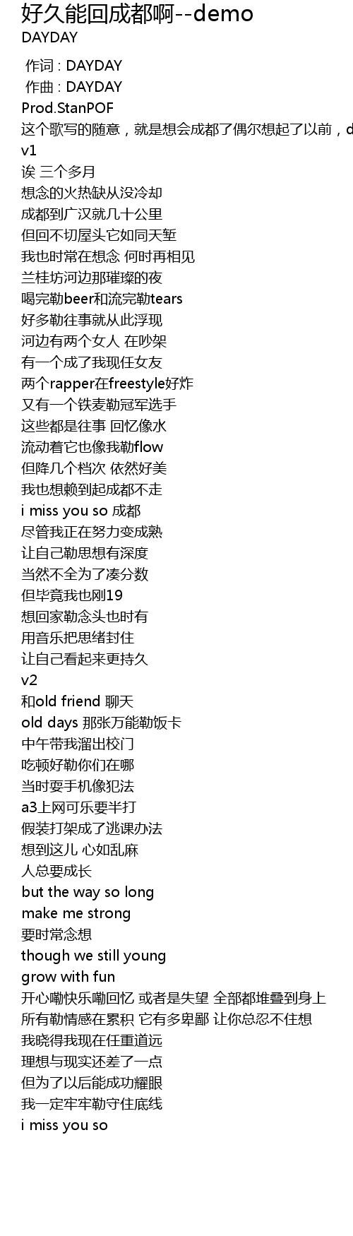 | [00:05.678] | 这个歌写的随意,就是想会成都了偶尔想起了以前,demo版本,随便唱唱,放假了会找棚的~~ |