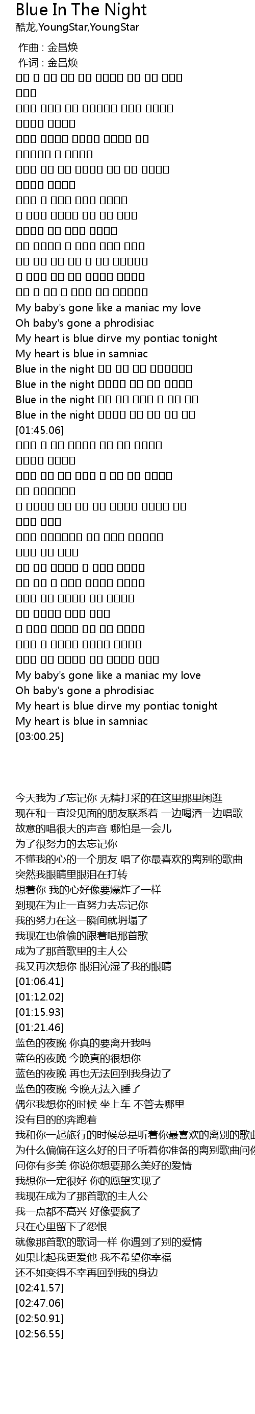 | [01:31.04] | Blue in the night 오늘밤엔 정말 니고 보고싶어 |