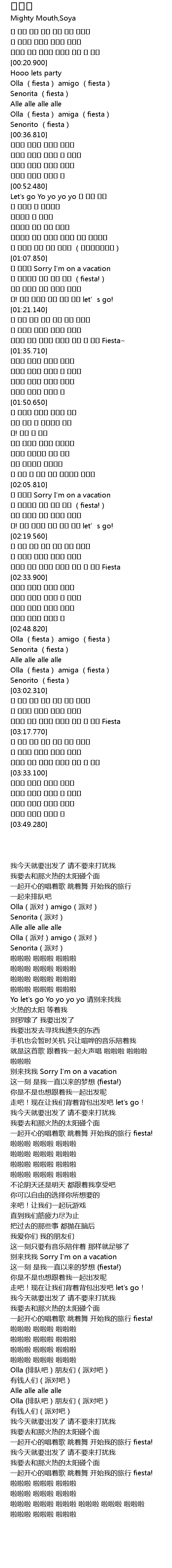 | [01:29.440] | 춤추고 노래 부르는 여행이 시작 된 거야 Fiesta~ |