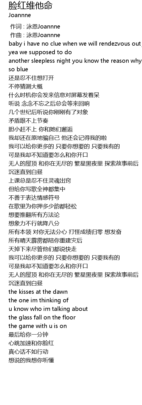 | [00:00.000] | 作词 : 泳恩Joannne |
