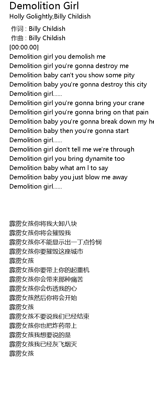 | [00:15.80] | Demolition girl you're gonna destroy me |