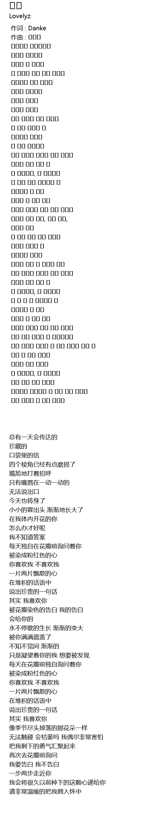 | [01:49.600] | 꽃잎에 물든 고백, 나의 고백, |