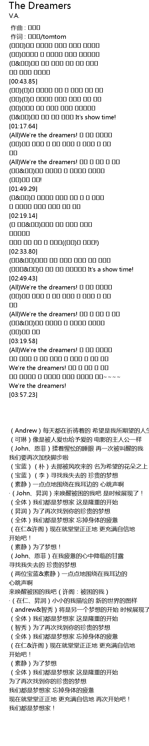 | [03:19.88] | (All)We're the dreamers! 더 크게 시작해봐 |