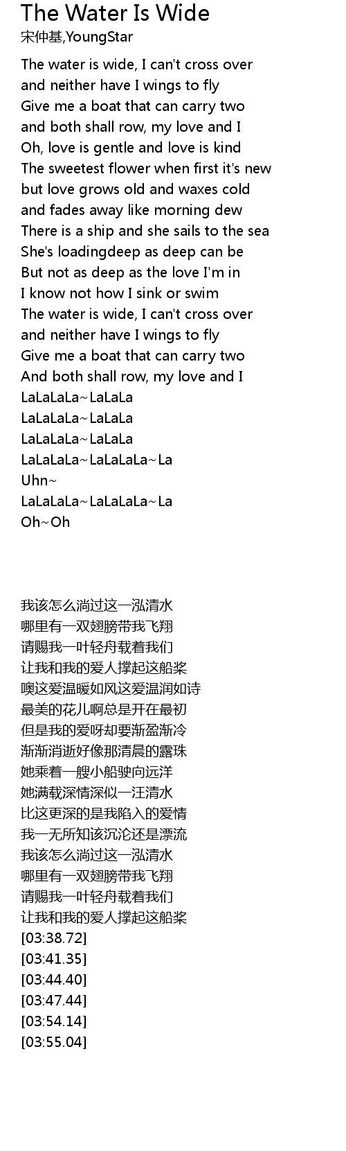 | [02:48.52] | The water is wide, I can't cross over |