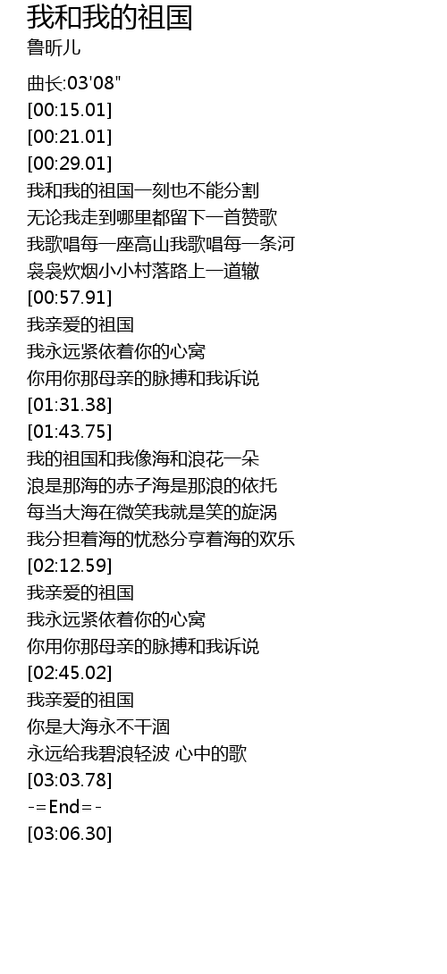 | [01:44.75] | 我的祖国和我像海和浪花一朵 |