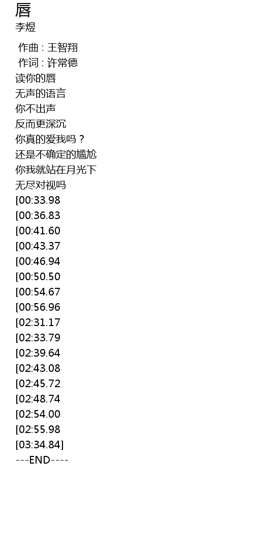| [02:04.12][00:33.98] | 吻你的唇 |