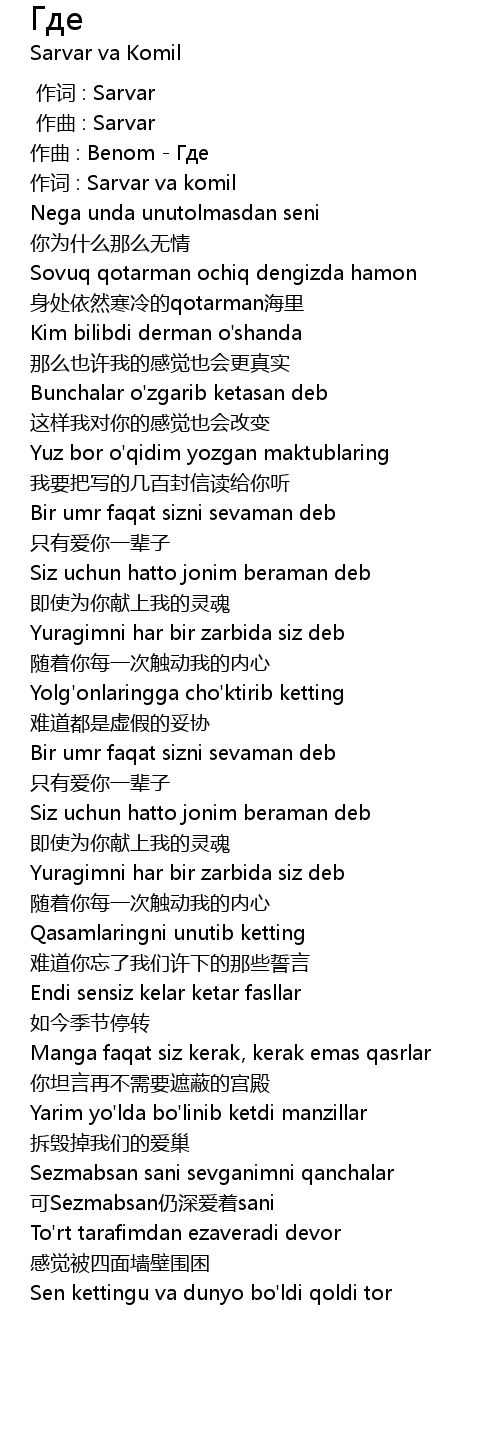 | [00:45.594] | 作词 : Sarvar va komil |