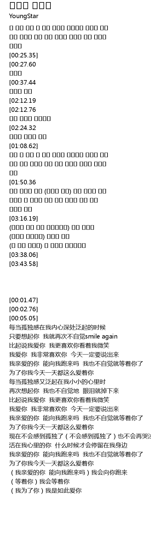 | [02:55.46][02:12.76][00:47.40] | 내사랑 그대 내게 달려올까요 나도 몰래 그대를 기다리다 |