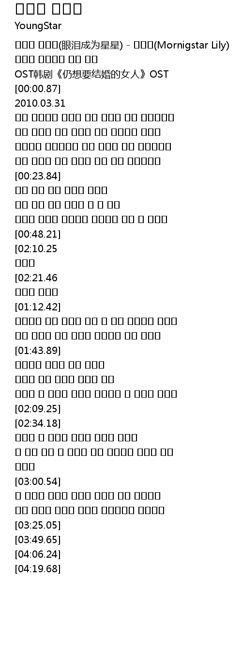 | [00:00.00] | 눈물이 별되어(眼泪成为星星) - 도예은(Mornigstar Lily) |