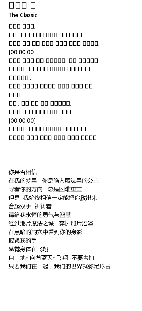 | [00:32.97] | 나의 꿈속에서 너는 마법에 빠진 공주란걸 |