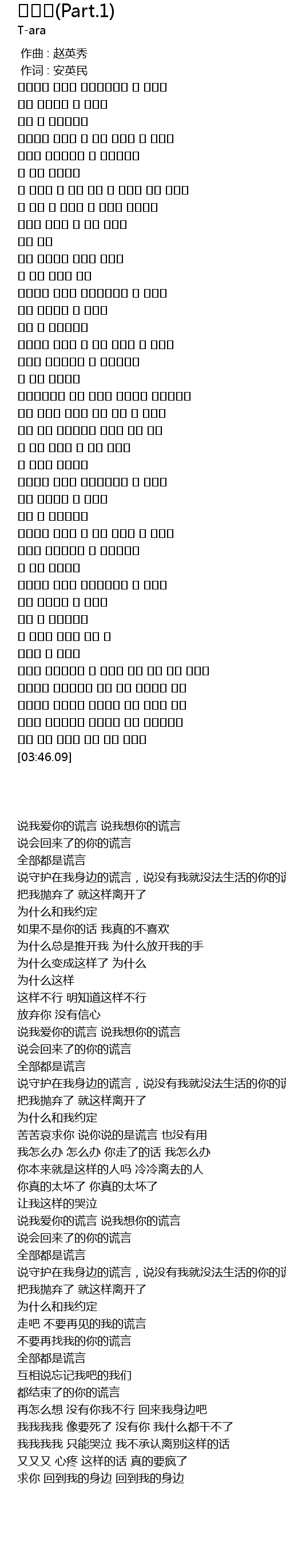 | [01:38.53] | 지켜준단 거짓말 나 없이 못산단 니 거짓말 |
