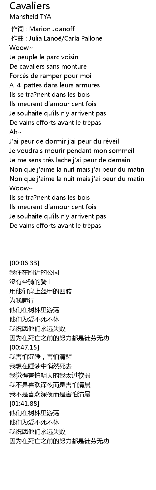 | [01:13.44] | Non que j' aime la nuit mais j' ai peur du matin |