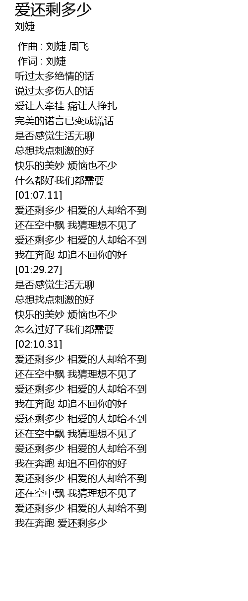 | [02:31.29] | 爱还剩多少 相爱的人却给不到 |