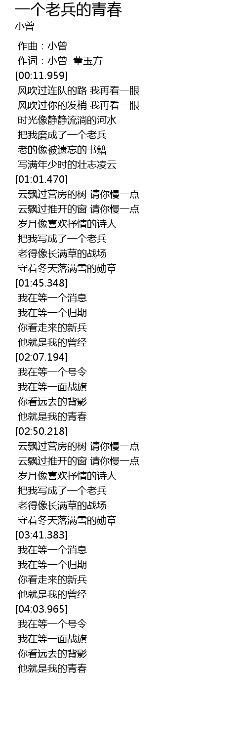 | [00:20.789] | 风吹过连队的路 我再看一眼 |