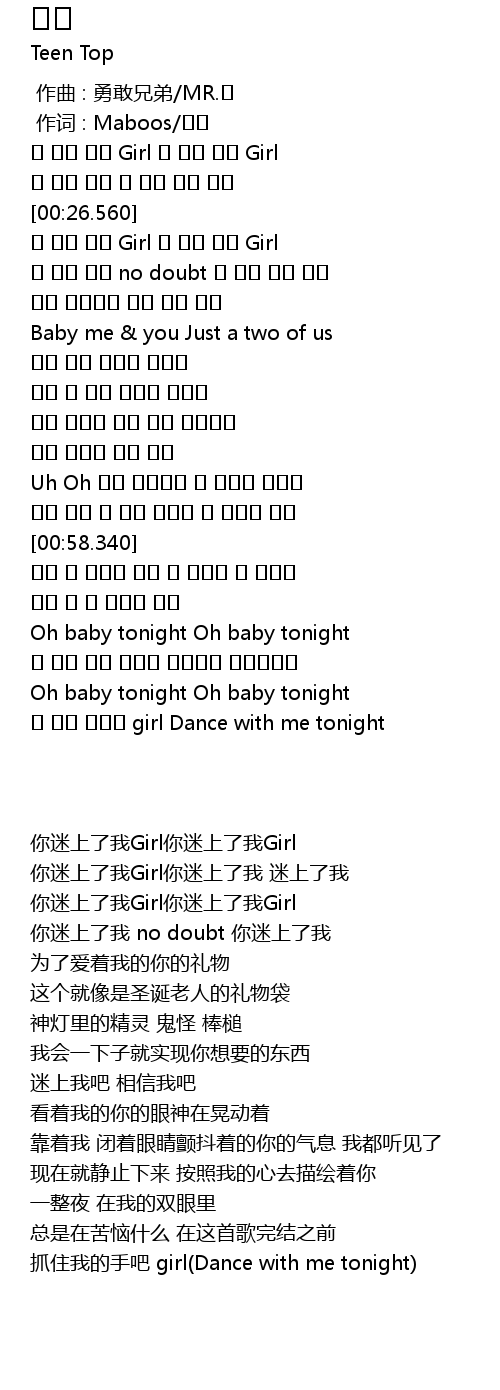 | [01:18.460] | 내 손을 잡아줘 girl Dance with me tonight |